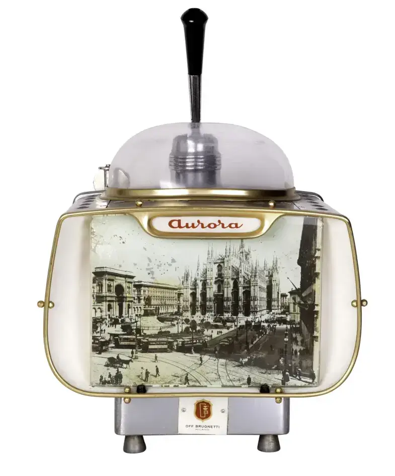 23.05.1947dopo una ventennale esperienza passata presso una ditta di macchine da caffè, il Cav. Giuseppe Brugnetti fonda la società ”Officine Brugnetti” produttrice di macchine da caffè, montapanna, frullini per frappè e tritaghiacci con il marchio “Aurora” .Le prime macchine da caffè sono costituite da una caldaia posizionata in modo verticale (macchine da caffè a colonna) e un sistema di riscaldamento a carbone tipico dell’epoca.Anni ‘50Si iniziano ad utilizzare per la realizzazione delle macchine da caffè materiali come rame e acciaio inox , si cura il design e l’estetica, si introducono il gruppo idraulico e il gruppo leva.